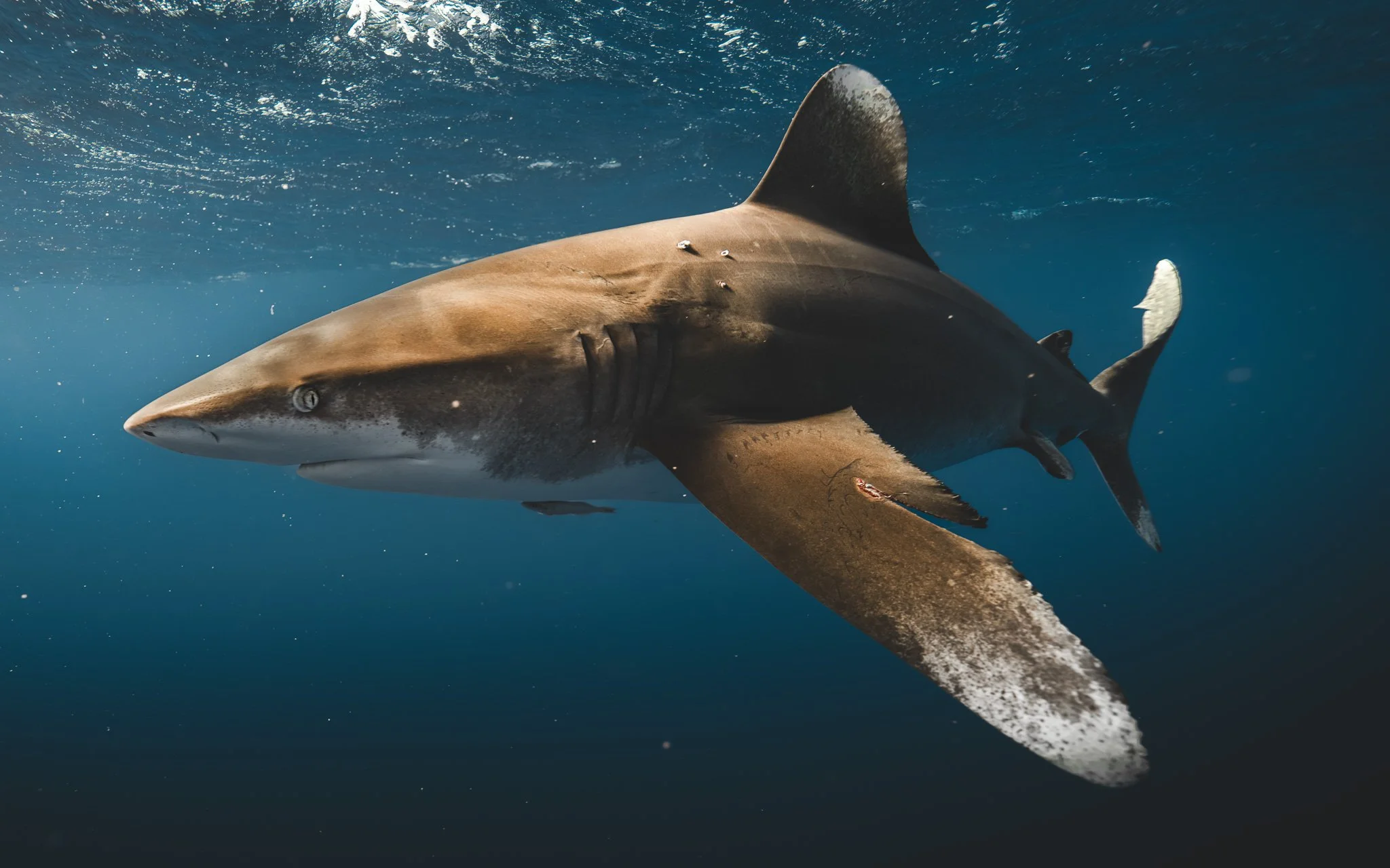 We’ll spend a lot of time in the open ocean where we have high chances of seeing pelagic shark species such as the amazing Oceanic whitetip shark, called “Parata” in French Polynesia.